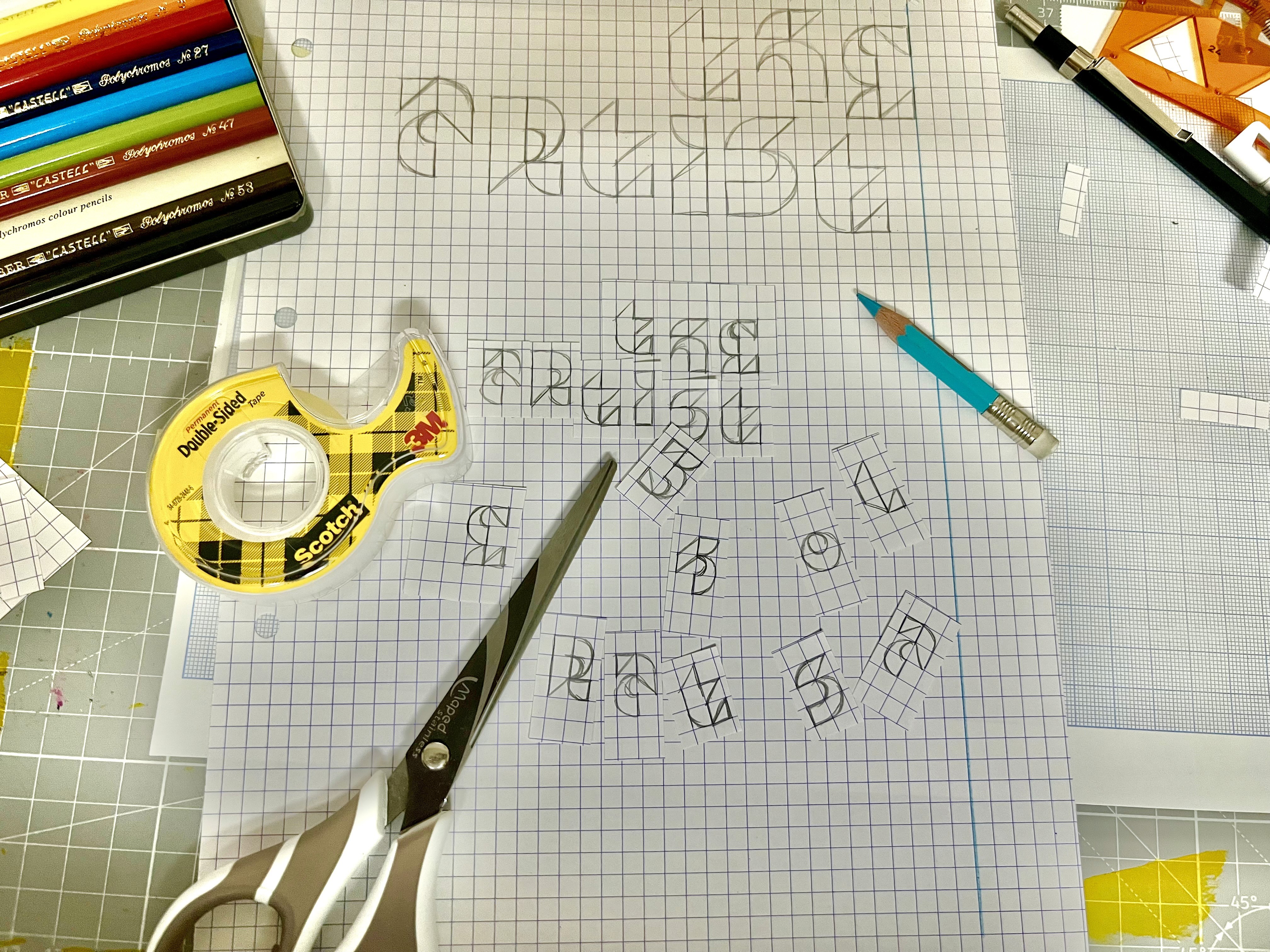 Draw, cut, paste, all within a 3x2 grid and five basic shapes. Assemble letters, create words and convey meaning.